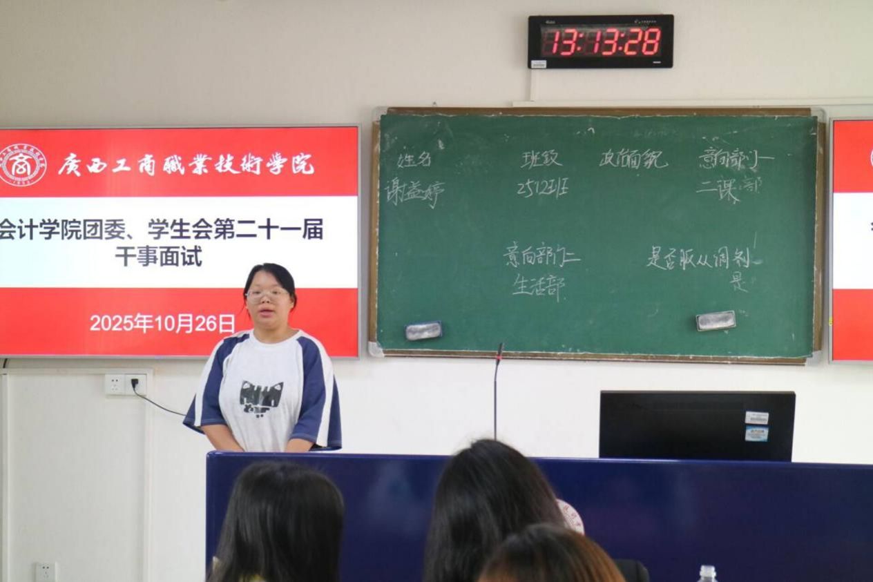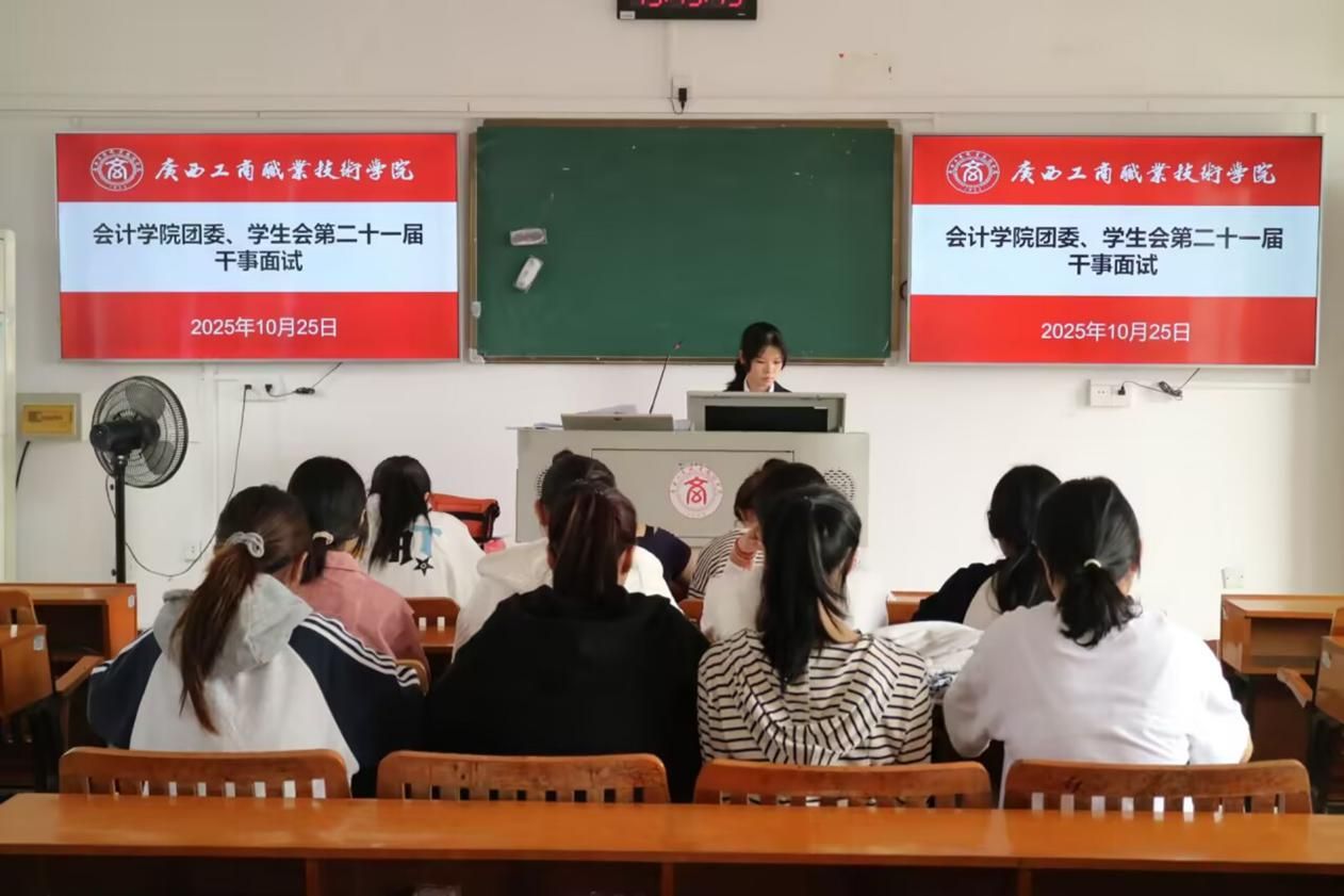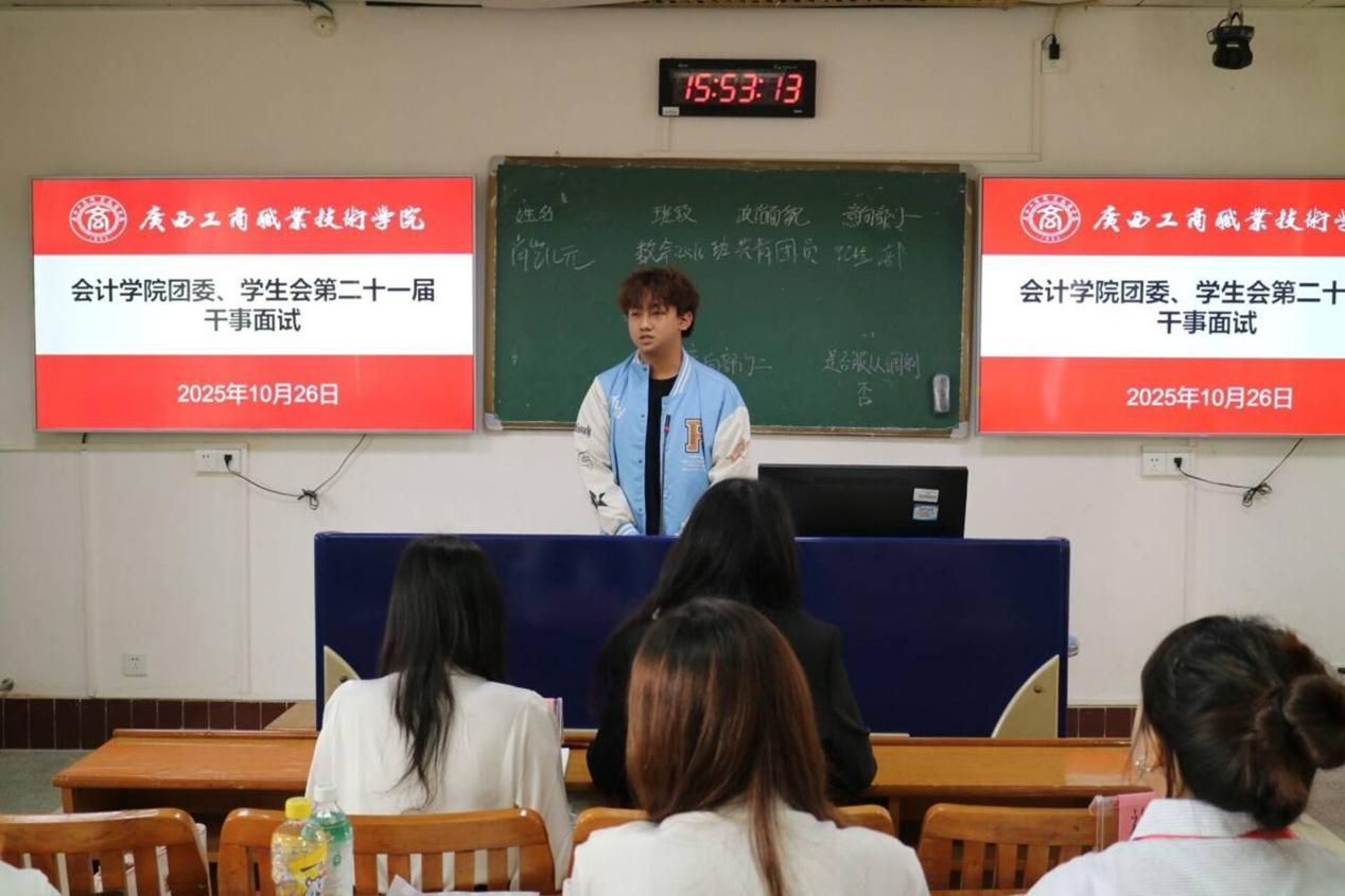 为选拔优秀新生力量,壮大团学骨干队伍,会计学院团委、学生会分别于2025年10月25日、26日下午在武鸣校区B3-201教室和中尧校区2教301教室开展第二轮面试工作。团委、学生会主席团成员、各部门负责人及全体实习干事共同参与了本轮面试。