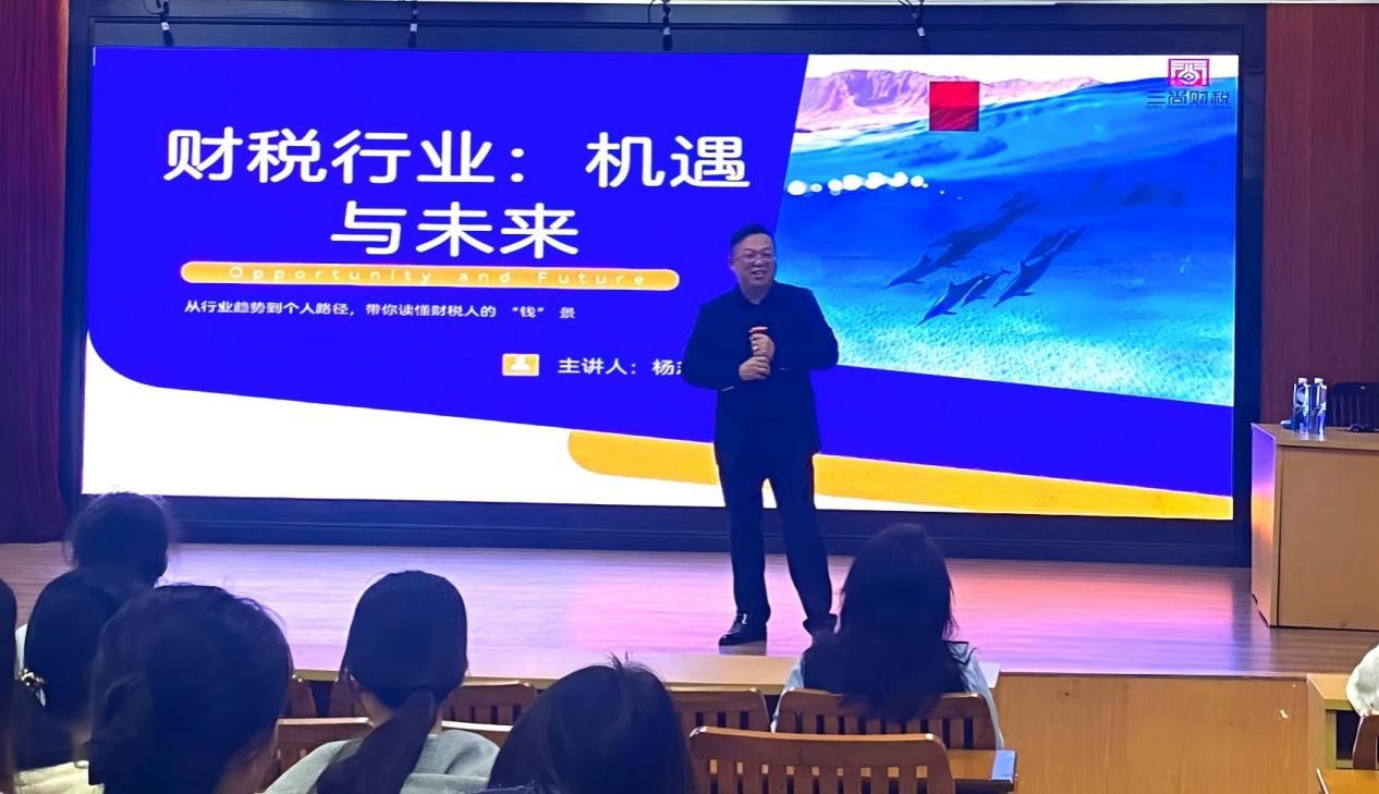 讲座现场座无虚席,气氛热烈。杨董事长结合20余年从业经验,从政策环境、市场趋势与技术变革三个维度,深入剖析了财税行业的发展前景。他重点阐述了税务筹划、财税数字化及跨境税务三大"黄金赛道"的发展机遇,指出这些领域正面临巨大的人才缺口。同时,他还详细解读了企业对新人的能力要求,强调专业基础、工具应用与政策敏感度的重要性。