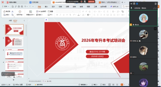 为使同学们及时了解2026年专升本考试相关政策与安排,数会2316-2319班近日组织开展了专升本考试专题线上培训会。本次培训会由辅导员黄丝丝老师主持,全体相关学生参加。