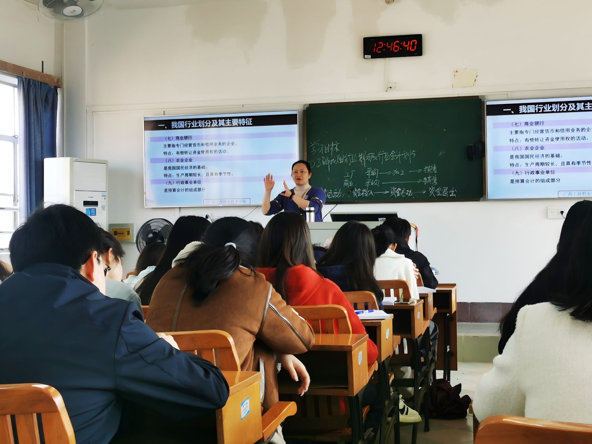 听课组先后走进了两门专业课的课堂。在外聘教师雷荔珺主讲的《粮食与其他行业会计》课堂上,雷老师备课充分,紧扣教学大纲,将行业实际业务案例自然融入理论教学中,讲解条理清晰。班级学生出勤率高,听课专注,课堂纪律良好。