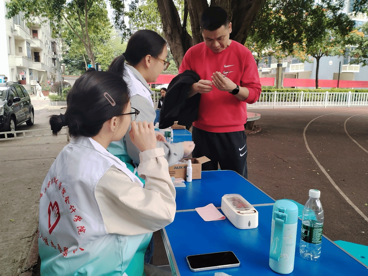 活动前期,志愿服务队通过班级通知、线下摆点等渠道宣传,明确活动时间、地点及服务内容,吸引广大同学积极参与。活动当日,志愿者们提前完成场地布置、物资清点与流程演练,确保活动有序推进。活动现场设置了眼镜清洗区与视力检测区两大功能区域。在眼镜清洗区,志愿者们使用专业的眼镜清洗设备,为同学们细致清洁镜片污渍、镜架缝隙,同时讲解日常眼镜保养的注意事项,帮助同学们养成科学的护镜习惯。在视力检测区,志愿者们借助标准视力表,为同学们提供基础视力检测服务,记录视力数据,并结合检测结果给出用眼健康建议,提醒同学们注意合理用眼、预防近视。活动过程中,志愿者们以热情周到的服务有序引导同学排队等候,现场秩序井然,氛围温馨融洽。